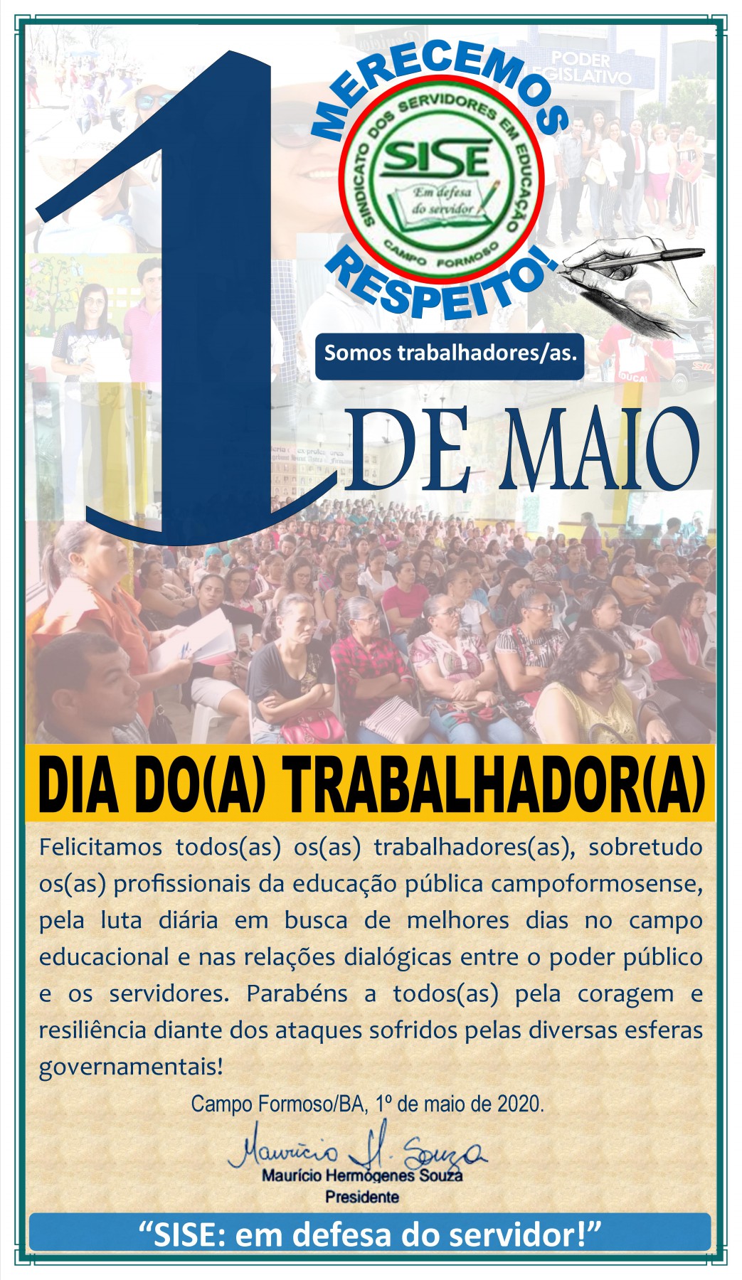 SERVIDORES DE MAOS DADASServidores de mãos dadas, olhos fechados, num ato de “oração coletiva”, assim foi iniciada na manha desta quarta-feira (04), mais uma assembléia extraordinária do SISE (Sindicato dos servidores da educação do município de Campo Formoso). Após este momento de demonstração de fé e unidade a Presidente do sindicato, Marilândia Alecrim, informou a categoria sobre o movimento paredista e os próximos passos, inclusive sobre a mobilização que ocorrera no dia 13 próximo, por ocasião da comemoração do dia do PROFESSOR (que é comemorado dia 15 de outubro).