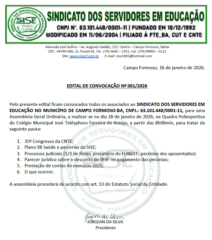 CONVOCAÇÃO PARA ASSEMBLEIA GERAL ORDINÁRIA - SISE: SINDICATO DOS SERVIDORES EM EDUCAÇÃO DE CAMPO FORMOSO